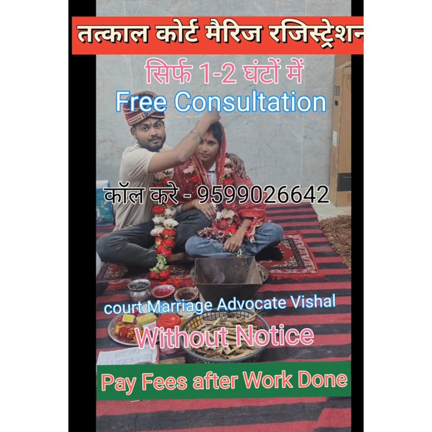 Delhi Court Marriage | Call +919599026642 Vishal Associates is a trusted & secure Law Firm in Delhi NCR Ghaziabad that provides Court Marriage Services in Delhi NCR Ghaziabad with Legally & Safe Secure Services. We Provide Same Day Court Marriage Certificate within 2 Hours from Delhi NCR Ghaziabad Govt. Without Notice at Home - Genuine Fees - No Hidden Charges. * WE KEEP YOUR INFORMATION CONFIDENTIAL * NO ONE CAN CHALLENGE OUR SERVICES Our Office address 👇🏻 Delhi Chamber : Chamber no. 1077, Western Wing, Tis Hazari, Delhi Ghaziabad Chamber : Chamber no. 41, Sadar Tahsil, Ghaziabad Noida Chamber : Chamber No. 53, S.R Compound opp. NTPC Building Sec-23, Noida Our Services : Delhi Court Marriage | Court Marriage in Delhi | Court Marriage Delhi | Same Day Court Marriage in Delhi | Tatkal Court Marriage in Delhi | Urjent Court Marriage in Delhi | Instant Court Marriage in Delhi | Court Marriage in Delhi | NRI Court Marriage in Delhi | Muslim Court Marriage in Delhi | Court Marriage Certificate | Same Day NRI Court Marriage in Delhi | Same Day Foreigner Court Marriage in Delhi | Inter Religion Court marriage in Delhi | Inter caste Court Marriage in Delhi | Love Marriage in Delhi | Arya Samaj Marriage in Delhi | Court Marriage Lawyer in Delhi | Best Court Marriage Advocate in Delhi | Same Day Christian Court Marriage in Delhi | Same Day Hindu Muslim Court Marriage in Delhi | One Day Court Marriage in Delhi | Delhi Court Marriage Procedure Fees | Delhi Court Marriage Fees