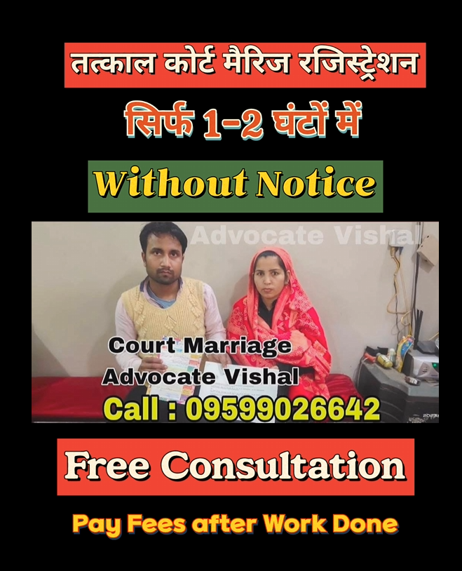 Tatkal Court Marriage in Delhi | Call +919599026642 Vishal Associates is a trusted & secure Law Firm in Delhi NCR Ghaziabad that provides Court Marriage Services in Delhi NCR Ghaziabad with Legally & Safe Secure Services. We Provide Same Day Court Marriage Certificate within 2 Hours from Delhi NCR Ghaziabad Govt. Without Notice at Home - Genuine Fees - No Hidden Charges. * WE KEEP YOUR INFORMATION CONFIDENTIAL * NO ONE CAN CHALLENGE OUR SERVICES Our Office address 👇🏻 Delhi Chamber : Chamber no. 1077, Western Wing, Tis Hazari, Delhi Ghaziabad Chamber : Chamber no. 41, Sadar Tahsil, Ghaziabad Noida Chamber : Chamber No. 53, S.R Compound opp. NTPC Building Sec-23, Noida Our Services : Delhi Court Marriage | Court Marriage in Delhi | Court Marriage Delhi | Same Day Court Marriage in Delhi | Tatkal Court Marriage in Delhi | Urjent Court Marriage in Delhi | Instant Court Marriage in Delhi | Court Marriage in Delhi | NRI Court Marriage in Delhi | Muslim Court Marriage in Delhi | Court Marriage Certificate | Same Day NRI Court Marriage in Delhi | Same Day Foreigner Court Marriage in Delhi | Inter Religion Court marriage in Delhi | Inter caste Court Marriage in Delhi | Love Marriage in Delhi | Arya Samaj Marriage in Delhi | Court Marriage Lawyer in Delhi | Best Court Marriage Advocate in Delhi | Same Day Christian Court Marriage in Delhi | Same Day Hindu Muslim Court Marriage in Delhi | One Day Court Marriage in Delhi | Delhi Court Marriage Procedure Fees | Delhi Court Marriage Fees