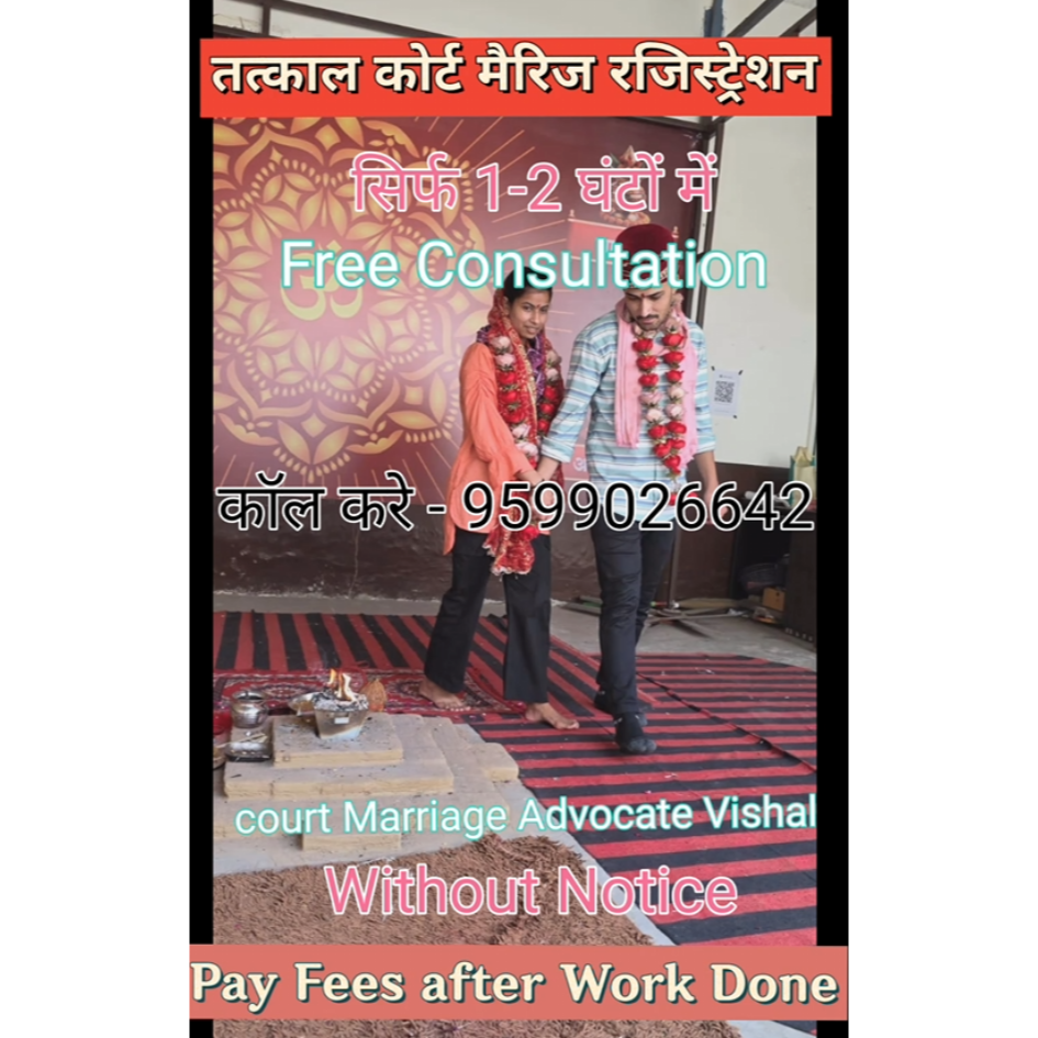 Tatkal Court Marriage in Delhi | Call +919599026642 Vishal Associates is a trusted & secure Law Firm in Delhi NCR Ghaziabad that provides Court Marriage Services in Delhi NCR Ghaziabad with Legally & Safe Secure Services. We Provide Same Day Court Marriage Certificate within 2 Hours from Delhi NCR Ghaziabad Govt. Without Notice at Home - Genuine Fees - No Hidden Charges. * WE KEEP YOUR INFORMATION CONFIDENTIAL * NO ONE CAN CHALLENGE OUR SERVICES Our Office address 👇🏻 Delhi Chamber : Chamber no. 1077, Western Wing, Tis Hazari, Delhi Ghaziabad Chamber : Chamber no. 41, Sadar Tahsil, Ghaziabad Noida Chamber : Chamber No. 53, S.R Compound opp. NTPC Building Sec-23, Noida Our Services : Delhi Court Marriage | Court Marriage in Delhi | Court Marriage Delhi | Same Day Court Marriage in Delhi | Tatkal Court Marriage in Delhi | Urjent Court Marriage in Delhi | Instant Court Marriage in Delhi | Court Marriage in Delhi | NRI Court Marriage in Delhi | Muslim Court Marriage in Delhi | Court Marriage Certificate | Same Day NRI Court Marriage in Delhi | Same Day Foreigner Court Marriage in Delhi | Inter Religion Court marriage in Delhi | Inter caste Court Marriage in Delhi | Love Marriage in Delhi | Arya Samaj Marriage in Delhi | Court Marriage Lawyer in Delhi | Best Court Marriage Advocate in Delhi | Same Day Christian Court Marriage in Delhi | Same Day Hindu Muslim Court Marriage in Delhi | One Day Court Marriage in Delhi | Delhi Court Marriage Procedure Fees | Delhi Court Marriage Fees